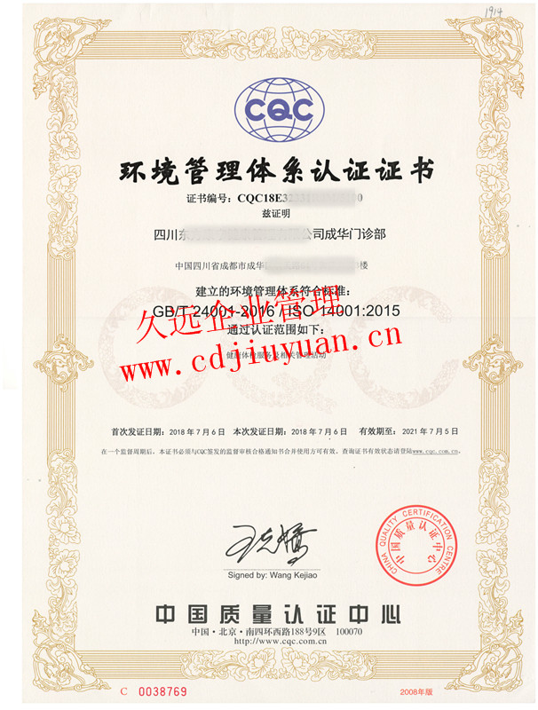 環境管理體系認證證書